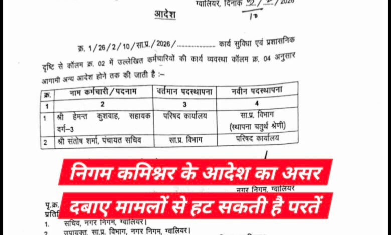 @अंशुल मित्तल, ग्वालियर। नगर निगम के GAD विभाग में बाबू के पद पर काम कर रहे, पंचायत सचिव संतोष शर्मा को परिषद कार्यालय भेजने का आदेश 10 फरवरी को कमिश्नर ने जारी किया। इस आदेश के बाद वर्ष 2024 का एक आदेश भी सामने आया, जिसमें पूर्व निगम कमिश्नर हर्ष सिंह ने संतोष शर्मा को जिला पंचायत वापस भेजने का आदेश जारी किया था।